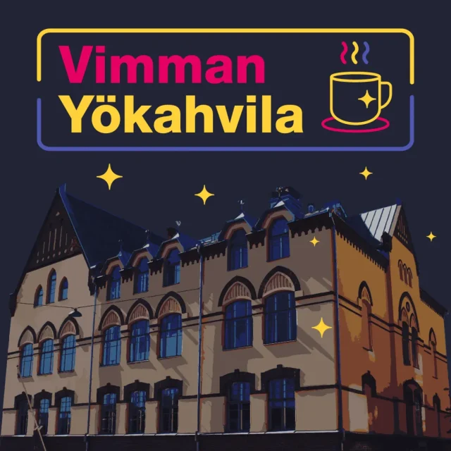 Yökahvilan ovet ovat auki nuorten taide- ja toimintatalo Vimmassa. Tarjolla on ilmaiseksi pientä yöpalaa (mm. välipalakeksejä), kahvia, teetä ja mehua. Voit tulla viettämään aikaa esimerkiksi kavereiden kanssa tai pelailemaan Vimman lautapelejä.